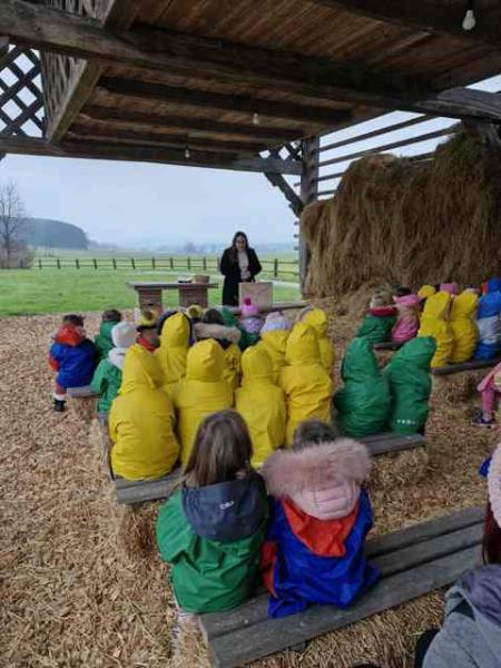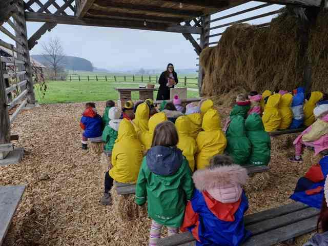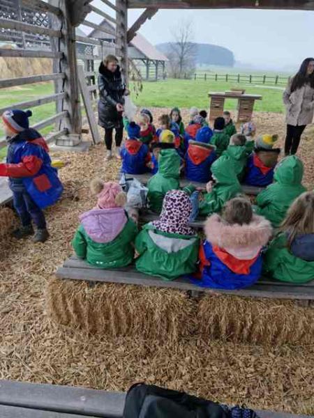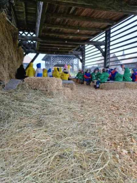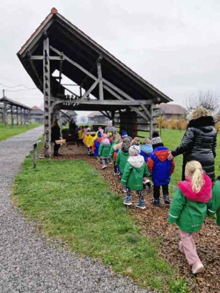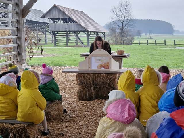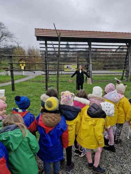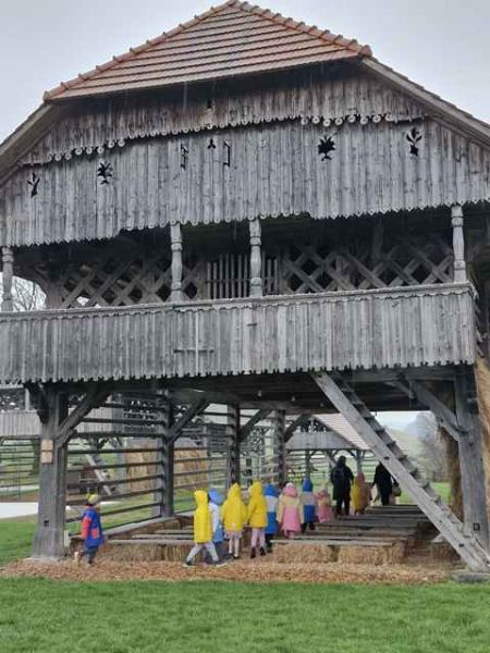 V torek, 25. 11. 2025, smo se skupini Baloni in Gumbi z avtobusom odpravili v Deželo kozolcev v Šentrupert. Tam nas je pričakala ga. Špela, ki nas je popeljala po muzeju na prostem in nam predstavila njihove kozolce.
