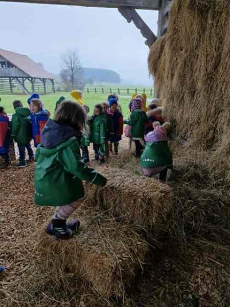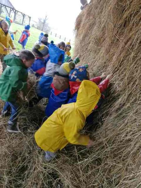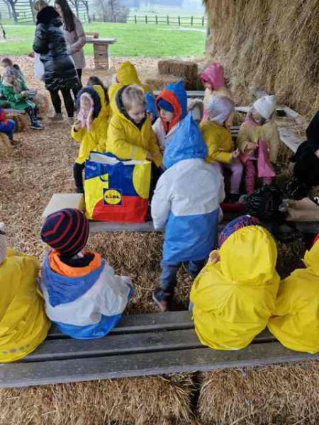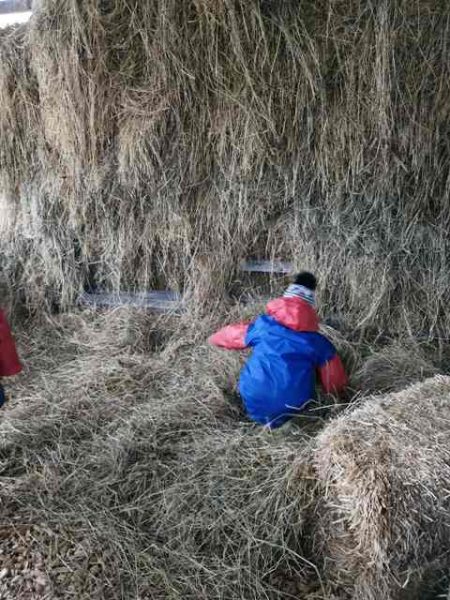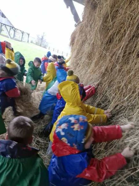 Obisk smo zaključili z naravnim poligonom iz bal sena, nato pa smo se vrnili na avtobus, ki nas je odpeljal nazaj v vrtec.