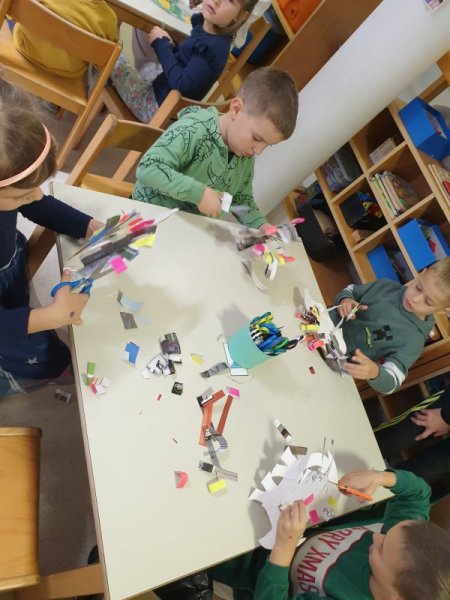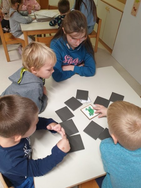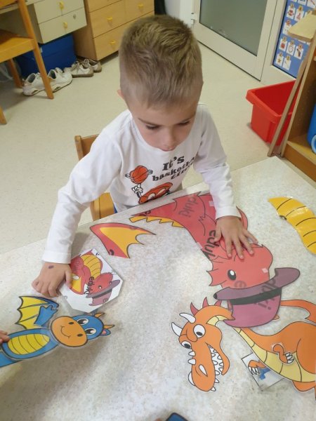 Sestavljali smo različne zmaje, utrjevali svojo koncentracijo z igro spomin »Tudi zmaji imajo svojo najljubšo barvo«, v kotičku »Zmajev frizerski salon« smo spretno uredili zmajčkom pričeske, svojega zmaja smo tudi umetniško pobarvali s svojo najljubšo barvo, izdelali smo pravo zmajevo kazalko, ki nam bo služila pri označevanju prebranih strani v slikanicah, na koncu pa smo Pogoltnega zmaja nahranili z našo prijaznostjo in igro.