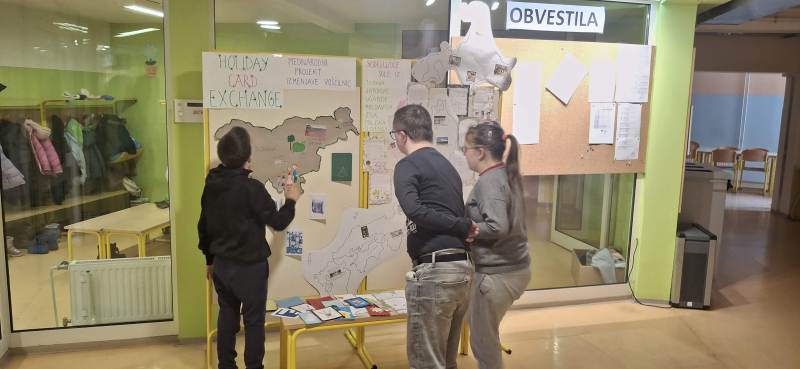 Učenci prvega razreda so s pomočjo učiteljice Mojce izdelali plakat z osnovnimi informacijami o Sloveniji, učenci oddelkov OŠPP pa so po spletu pobrskali in izdelali plakat o Japonski. Oboje smo skupaj s prejetimi voščilnicami razstavili v šolski jedilnici, kjer si jih lahko ogledate.